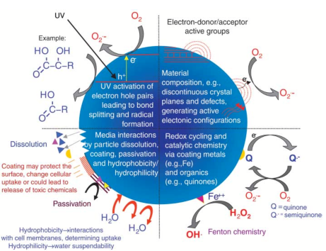 Hình 2.4 minh họa tầm quan trọng của thành phần vật liệu, cấu trúc điện tử, các loài bề mặt liên kết (ví dụ, chứa kim loại), lớp phủ bề mặt (chủ động hoặc thụ động) và độ hòa tan, bao gồm sự đóng góp của các loài bề mặt và lớp phủ và tương tác với các yếu tố môi trường khác (ví dụ, hoạt hóa UV).