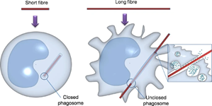 Các đại thực bào cố gắng bao vây và nuốt các sợi MWCNT dài. Khi chiều dài của sợi vượt quá khả năng bao bọc của đại thực bào (>15–20 μm), quá trình thực bào bị thất bại.