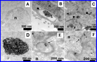 Các tế bào chưa được xử lý không có bất thường nào (A), trong khi các tế bào được xử lý bằng Ag-np cho thấy các thể nội bào lớn gần màng tế bào với nhiều hạt nano bên trong (B). Ảnh chụp bằng kính hiển vi điện tử cho thấy các thể lysosome có các hạt nano bên trong (mũi tên dày) và nằm rải rác trong tế bào chất (mũi tên mở). Mũi tên kim cương cho thấy sự hiện diện của hạt nano trong nhân (C). Hình ảnh phóng to của các nhóm nano cho thấy cụm này bao gồm các hạt nano riêng lẻ chứ không phải các khối (D). Hình ảnh cho thấy các thể nội bào trong tế bào chất nằm trong các chỗ lõm của màng nhân (E) và sự hiện diện của các hạt nano trong ty thể và trên màng nhân (F).