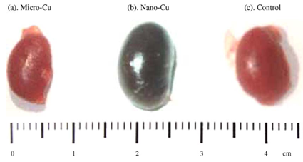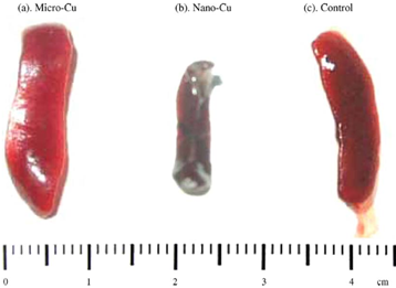 - Nano-copper gây tổn thương rõ ở thận, gan, lách, dẫn đến hoại tử, thoái hóa, viêm cầu thận, atrophy của lách.