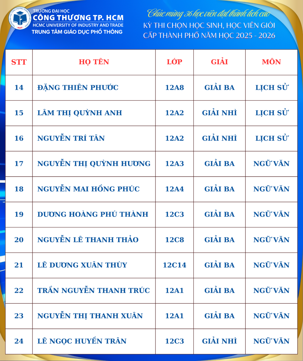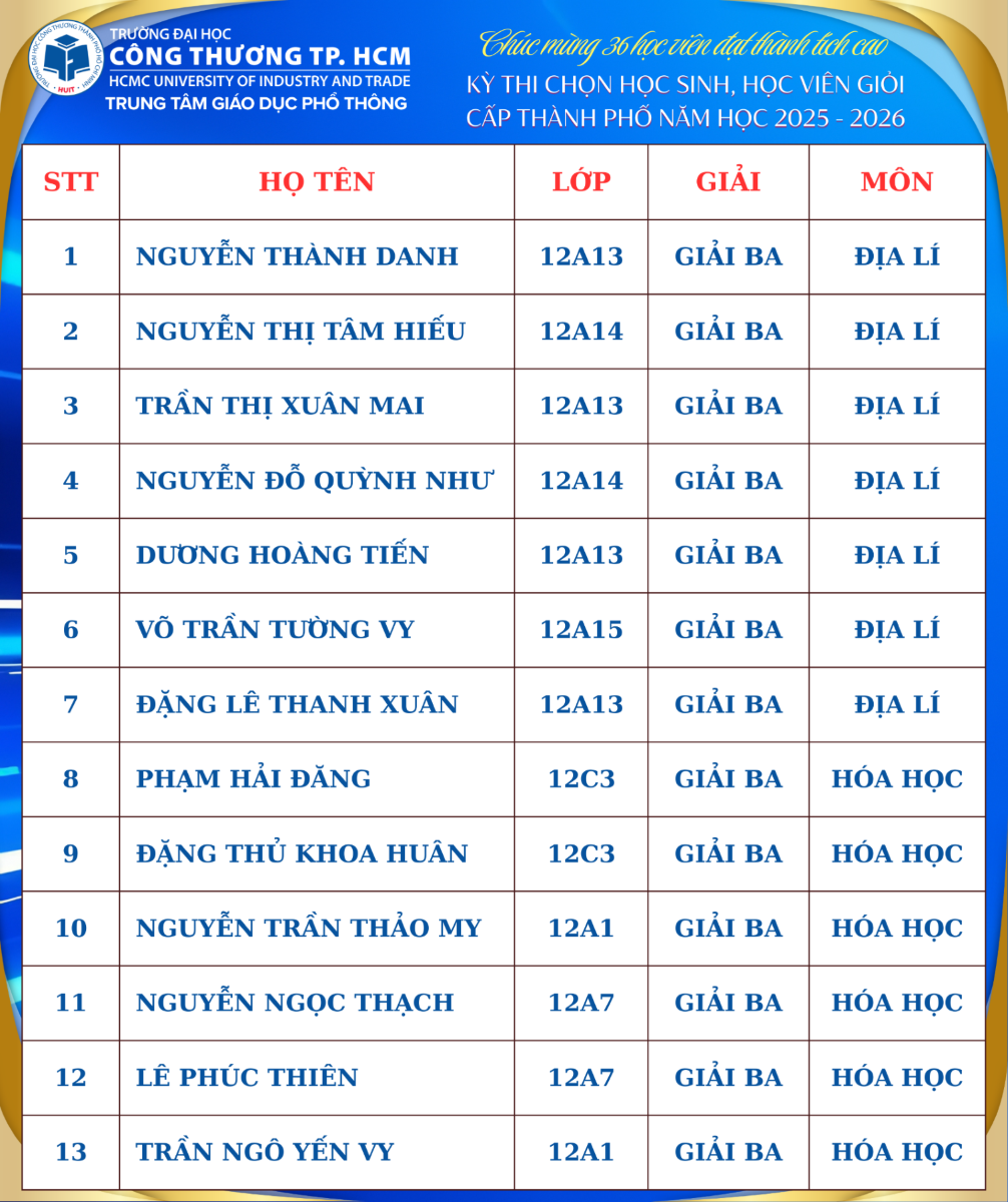 Trong niềm vui và tự hào của năm học 2025 – 2026, thầy và trò Trung tâm Giáo dục Phổ thông HUIT hân hoan đón nhận tin vui khi 36 học viên của Trung tâm đã xuất sắc đạt giải trong Kỳ thi Học sinh giỏi cấp Thành phố. Đây là thành quả đáng khích lệ, thể hiện sự nỗ lực bền bỉ của các em học sinh cùng sự tận tâm, trách nhiệm của đội ngũ thầy cô giáo trong công tác giảng dạy và bồi dưỡng.