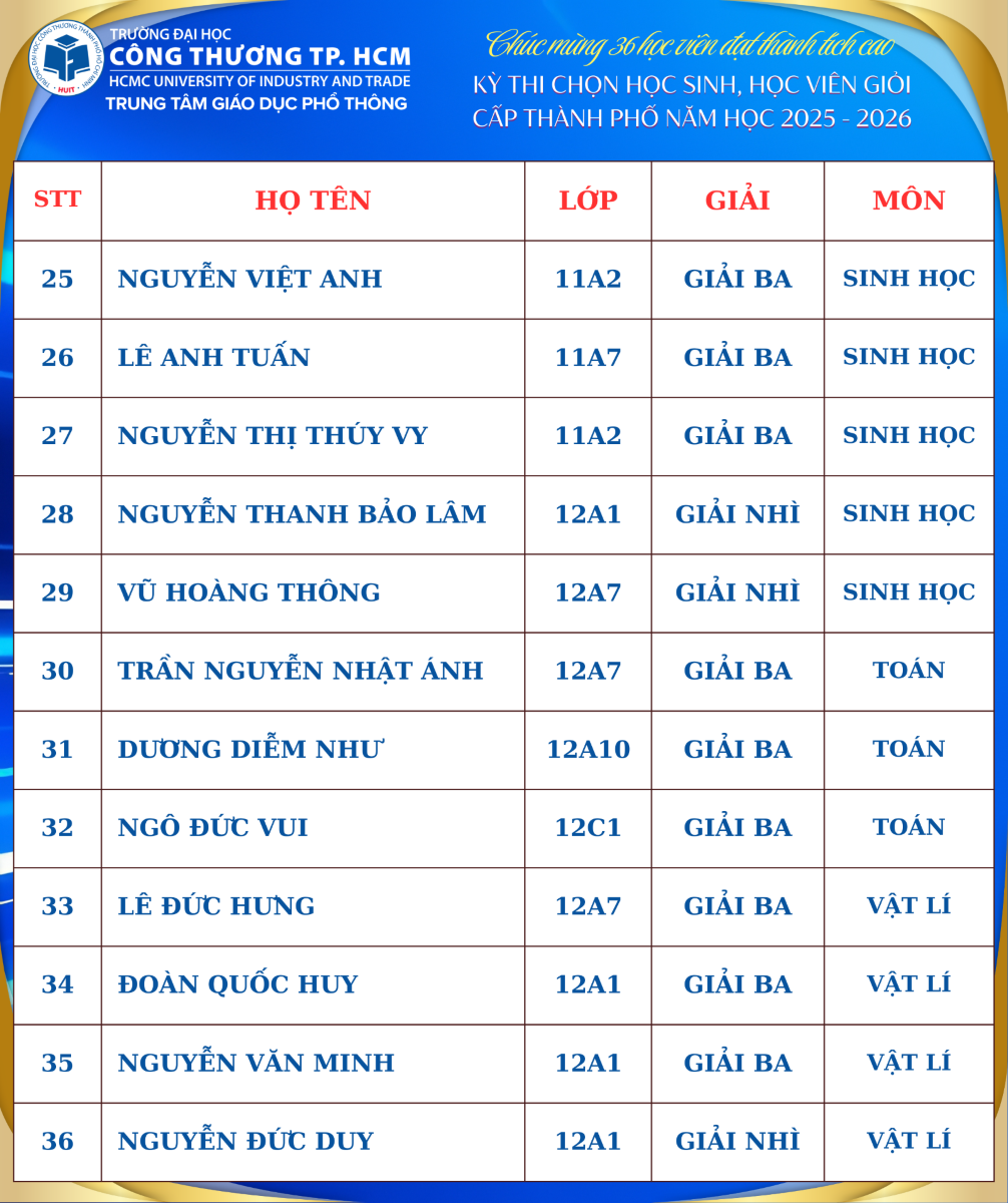 Xin chúc mừng 36 học viên đã đạt giải, đồng thời trân trọng gửi lời cảm ơn và chúc mừng đến quý thầy cô giáo đã tận tâm bồi dưỡng, dìu dắt các em. Chúc các em học sinh luôn giữ vững tinh thần học tập, tiếp tục tỏa sáng trên hành trình chinh phục tri thức.
