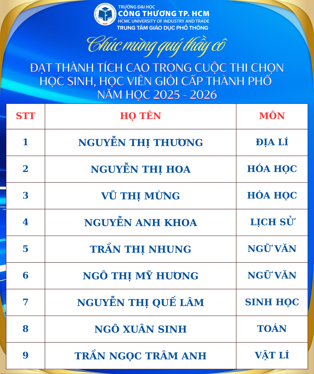 Thành tích của các em không chỉ là niềm vui của bản thân và gia đình mà còn là niềm tự hào chung của tập thể thầy và trò Trung tâm Giáo dục Phổ thông HUIT. Đây cũng là động lực để các em tiếp tục phát huy năng lực, giữ vững niềm đam mê học tập và chinh phục thêm nhiều thành tích cao hơn trong thời gian tới.