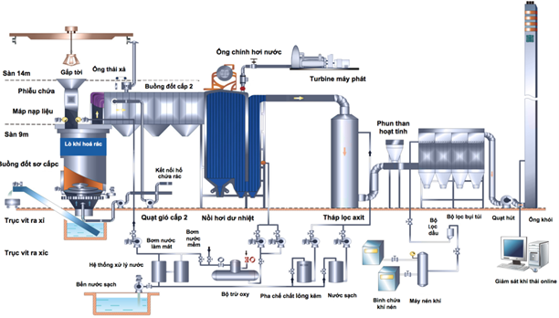 Hình 3. Sơ đồ quy trình công nghệ lò khí hóa rác thải tích hợp hệ thống thu hồi nhiệt và xử lý khí thải [7]