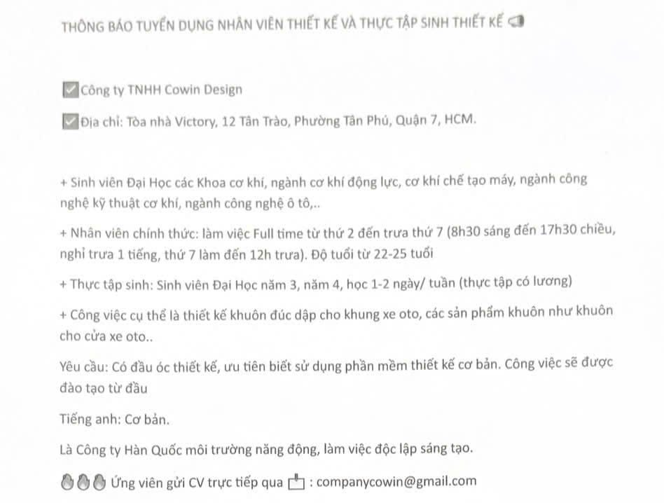 Công ty TNHH Cowin design thông báo tuyển dụng