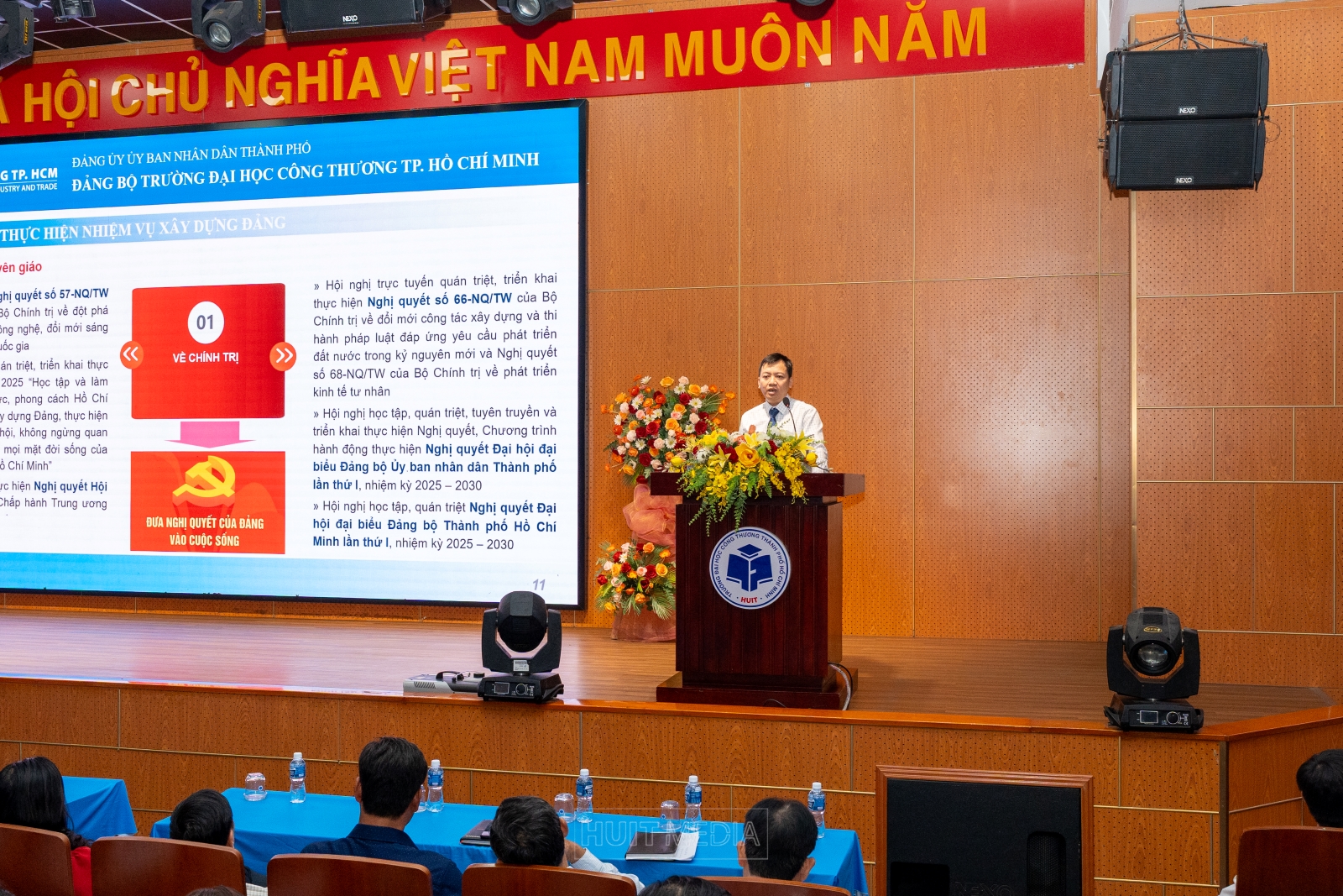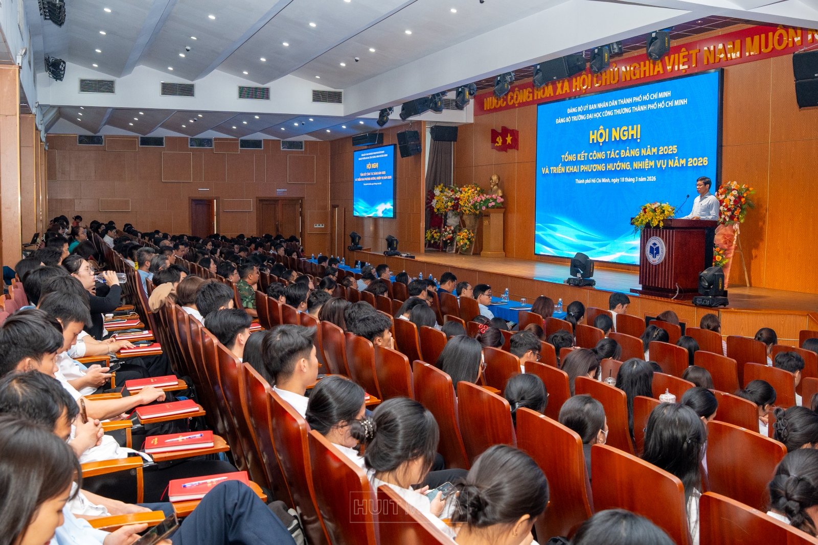 Ngày 18/3/2026, Đảng ủy Trường Đại học Công Thương TP.HCM đã tổ chức Hội nghị tổng kết công tác xây dựng Đảng năm 2025 và triển khai phương hướng, nhiệm vụ năm 2026 với sự tham dự của các đồng chí trong Ban Chấp hành Đảng bộ, cấp ủy các chi bộ trực thuộc và toàn thể đảng viên trong Đảng bộ Nhà trường. Đây là dịp quan trọng để Đảng bộ Nhà trường nhìn lại toàn diện kết quả công tác xây dựng Đảng trong năm 2025, đánh giá những kết quả đã đạt được, thẳng thắn nhìn nhận những tồn tại, hạn chế, đồng thời xác định rõ phương hướng, nhiệm vụ trọng tâm trong năm 2026.