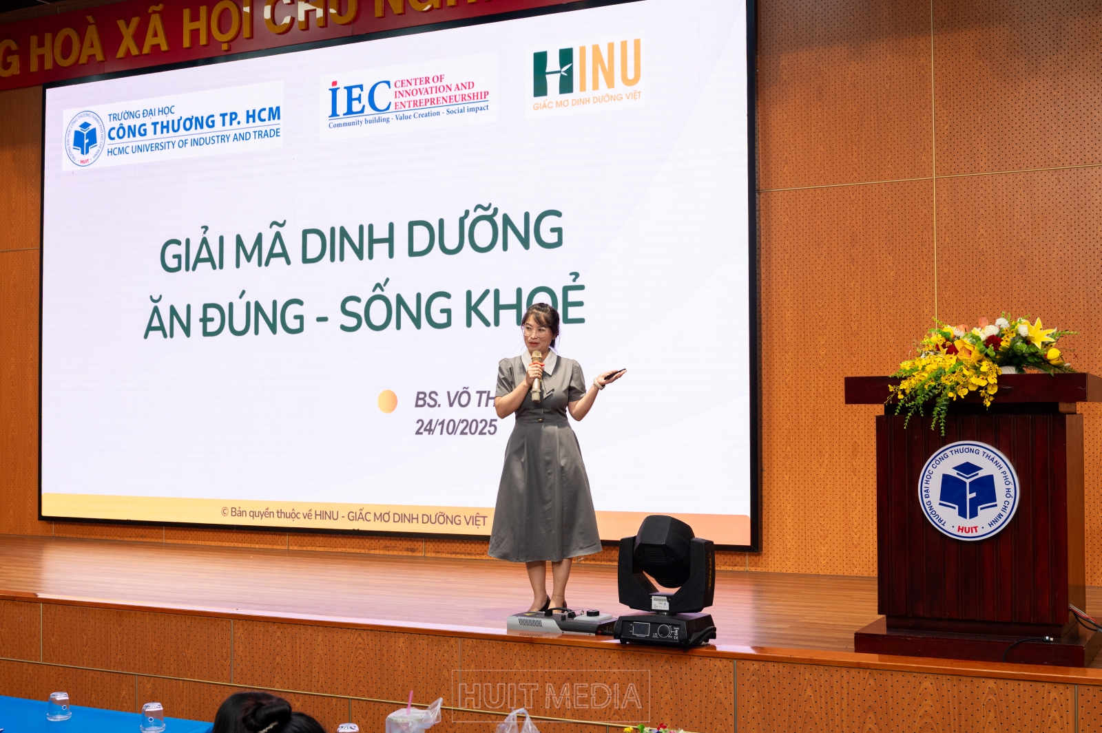 Bác sĩ Võ Thị Tố Uyên, bác sĩ phụ trách chuyên môn tại HINU, đã mang đến một bài học quan trọng về dinh dưỡng cho sinh viên. Với thông điệp: “Chọn nguồn năng lượng ổn định từ tinh bột, vì não bộ chỉ sử dụng glucose là nguồn năng lượng duy nhất,” bác sĩ Uyên nhấn mạnh rằng dinh dưỡng là yếu tố cốt lõi để duy trì sức khỏe và năng lượng, đặc biệt là đối với những sinh viên phải đối mặt với những khối lượng công việc và học tập khổng lồ.