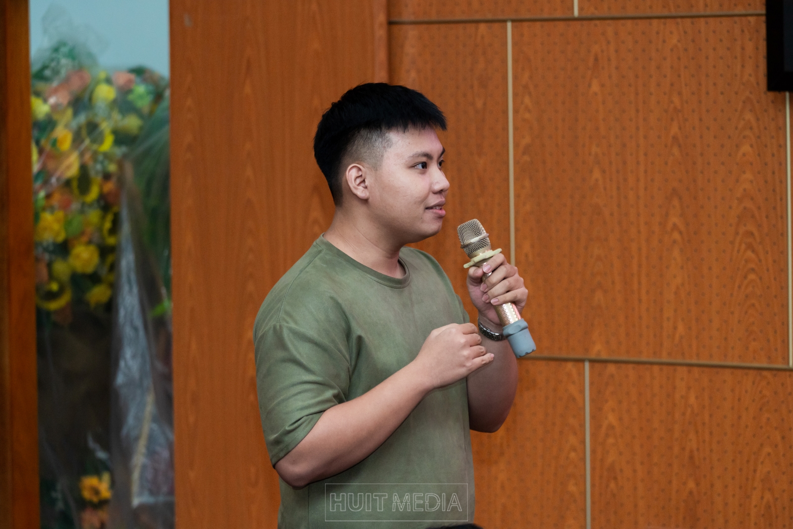 Hình ảnh em Quốc Huy, sinh viên năm ba khoa Cơ khí đặt câu hỏi cho chương trình
