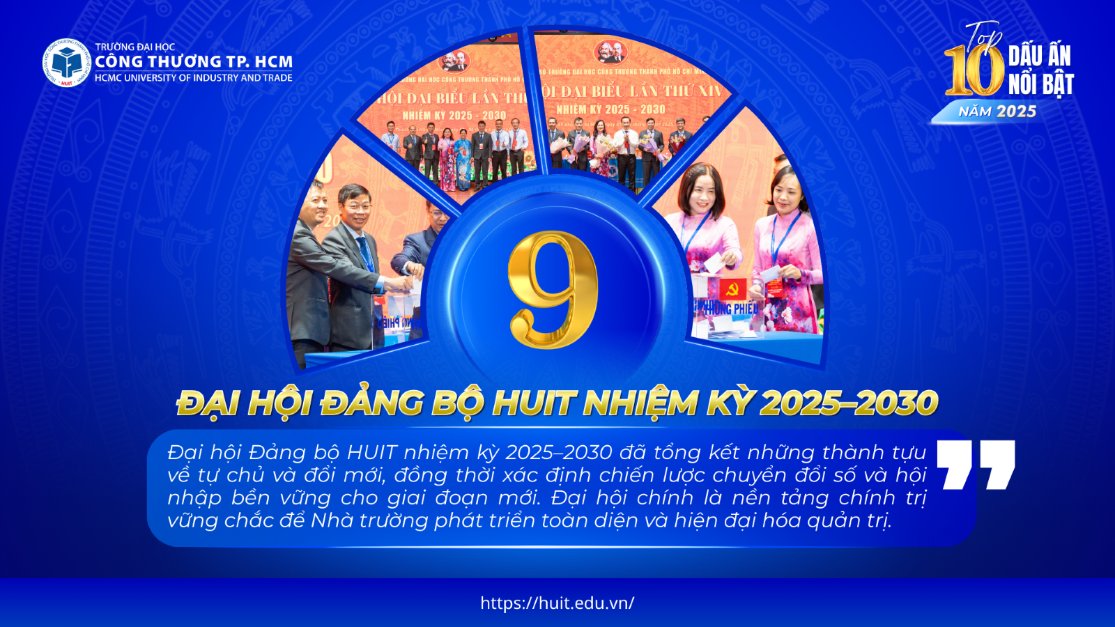 Đại hội đại biểu Đảng bộ Trường Đại học Công Thương TP.HCM (HUIT) nhiệm kỳ 2025–2030 là sự kiện chính trị quan trọng trong năm 2025, đánh dấu bước chuyển động chiến lược trong công tác lãnh đạo, quản trị và định hướng phát triển của Nhà trường. Đại hội tổng kết nhiệm kỳ 2020–2025, làm rõ các kết quả nổi bật về tự chủ đại học, đổi mới cơ chế hoạt động, nâng cao chất lượng đào tạo, nghiên cứu khoa học, quản trị hiện đại và xây dựng đội ngũ vững mạnh; đồng thời xác định phương hướng nhiệm kỳ 2025–2030 theo hướng đổi mới toàn diện, đẩy mạnh chuyển đổi số, tăng cường hợp tác quốc tế, phát triển nghiên cứu khoa học – đổi mới sáng tạo và nâng cao hiệu quả quản trị, đáp ứng yêu cầu hội nhập và phát triển bền vững.