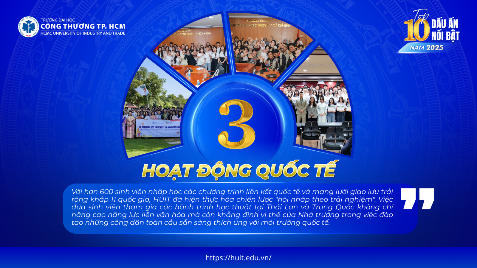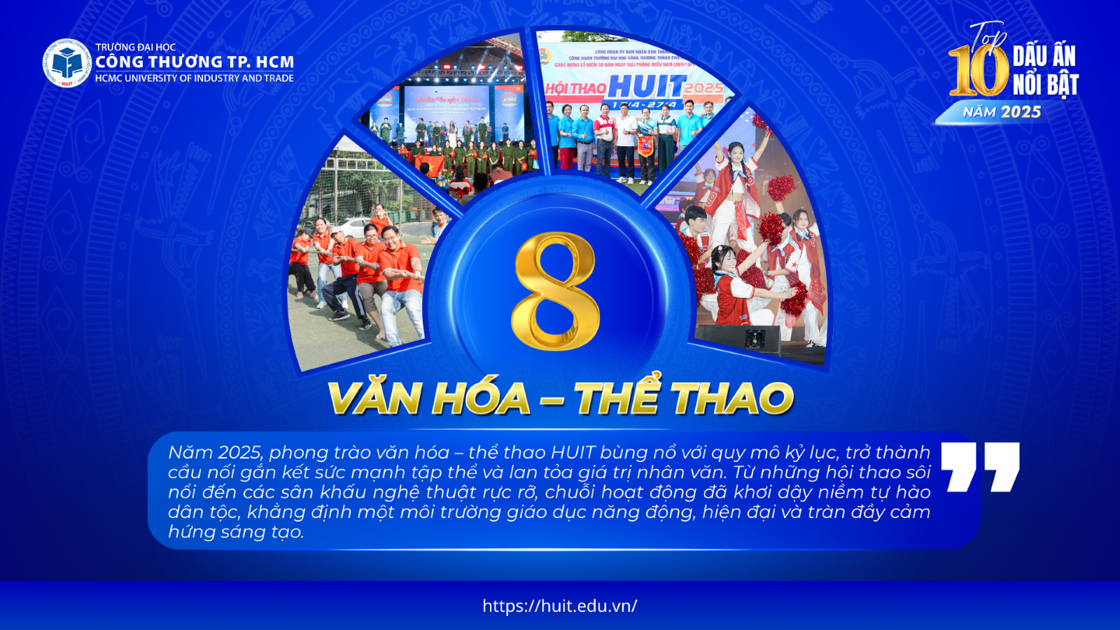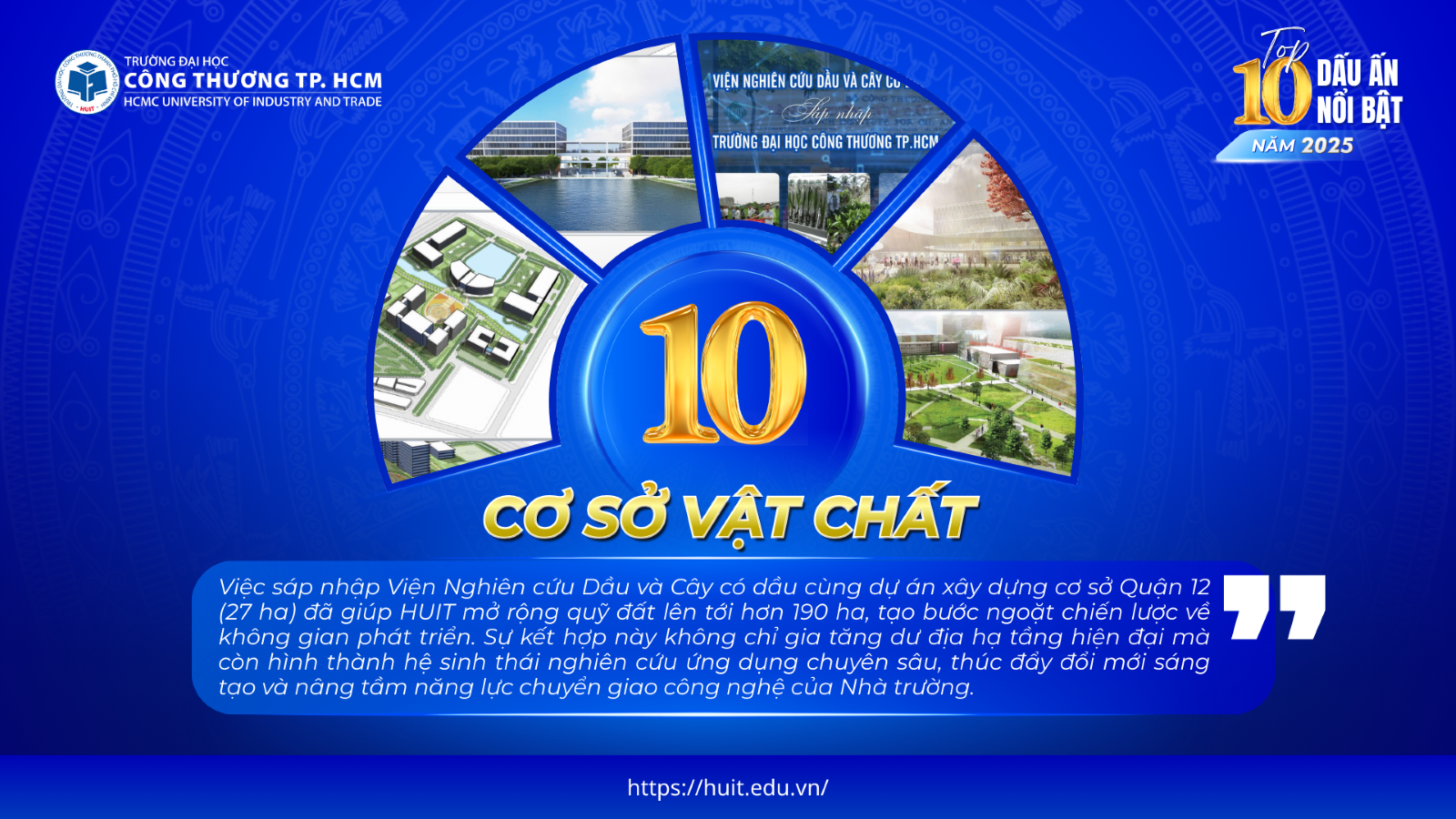 Mười dấu ấn, mười cột mốc tự hào – tất cả đã dệt nên một bức tranh HUIT 2025 đầy bản lĩnh và khát vọng. Khép lại năm 2025, HUIT không dừng lại ở những hào quang đã đạt được. Với tâm thế của người tiên phong, chúng ta sẽ tiếp tục viết tiếp những chương mới rực rỡ hơn, đưa thương hiệu Đại học Công Thương TP.HCM vươn xa trên bản đồ giáo dục quốc tế. Phía trước là bầu trời rộng mở, và với nội lực vững vàng đã được tôi luyện, HUIT sẵn sàng cho những hành trình bứt phá, khẳng định vị thế của một ngôi trường "Học thuật – Nhân văn – Hội nhập".